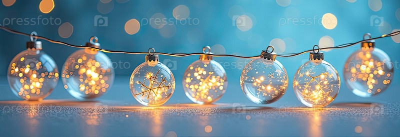 Гирлянда светящихся прозрачных шаров с золотыми огнями на синем фоне с блеском и боке. поздравительная карточка на Рождество и Новый год. ИИ генерируется