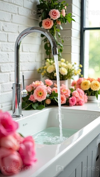 Ближайшая вода течет из крана в большую белую раковину цветочного магазина, окруженную массивом цветов. Цветочный бизнес, свежерезанные цветы, 8 марта, весна, день рождения. ИИ генерируется