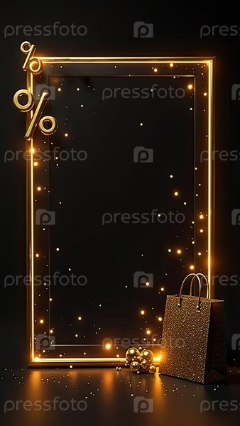 Неоновая светящаяся золотая рама с пространством для текста, процентный знак, сумки покупок на черном фоне. витрина магазина в Черную пятницу, распродажа, скидки, баннер, флаер. ИИ генерируется