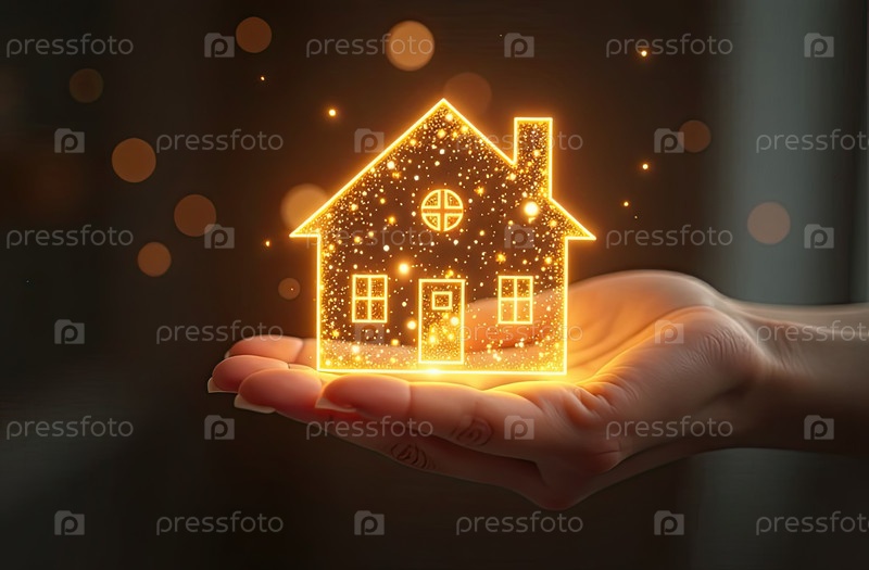 Золото светящийся символ уютного дома В ладонях рук с золотым блеском. Недвижимость, риэлтор, ипотека, страхование, бронирование, изоляция, мечта о собственном доме. ИИ генерируется