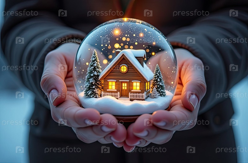 Магический стеклянный шар с крошечным современным домом и снегом внутри в уютной руке с рождественской елкой с гирляндами на фоне. страхование, ипотека, покупка недвижимости. ИИ генерируется