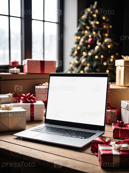 Ноутбук с белым экраном макет на столе в офисе рождественского декора с подарочными коробками для сотрудников, магазины, корпоративные подарки, Черная пятница,