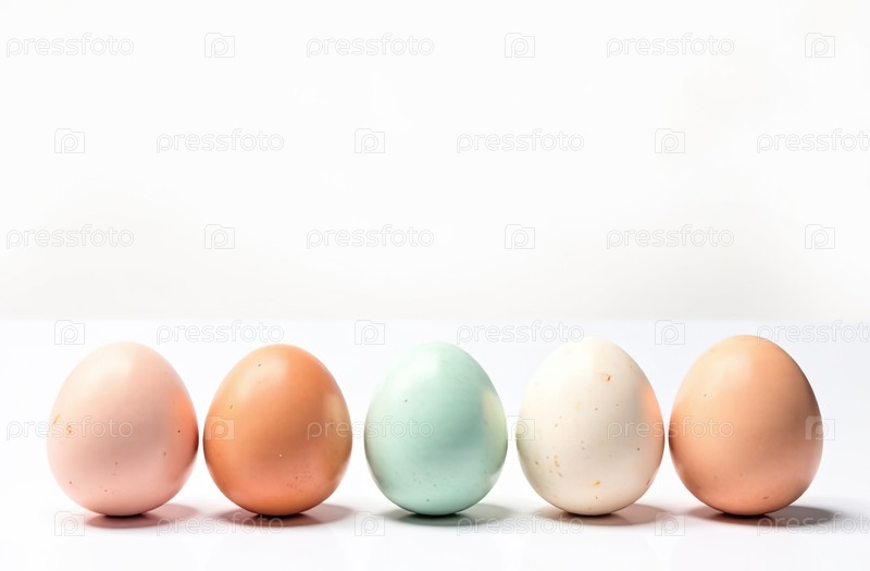 Внизу изображения находятся пять яиц со свободным пространством сверху изображения для текста, пастельные цвета яйца, белый фон. Пасхальный баннер с пробелом для текста. ИИ генерируется