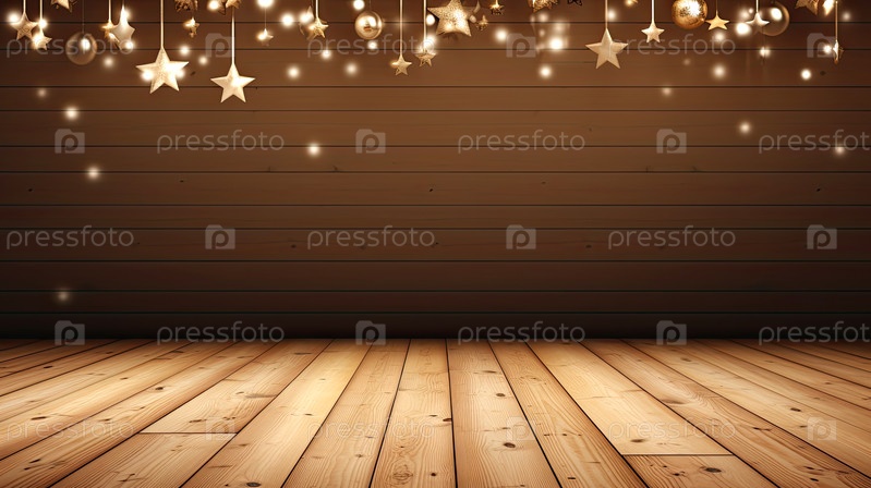 Пустой деревянный пол и стена для монтажа продуктового дисплея с рождественским декором, боке, секины и фейры. Копирование пространства, Рождество и Новый год. ИИ генерируется