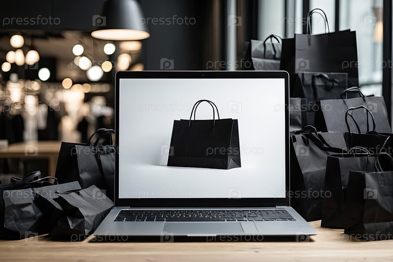 Ноутбук с белым экраном макет на столе в офисе в торговом центре рождественского декора с сумками, сумочками для покупок, пакетами, Черная пятница,