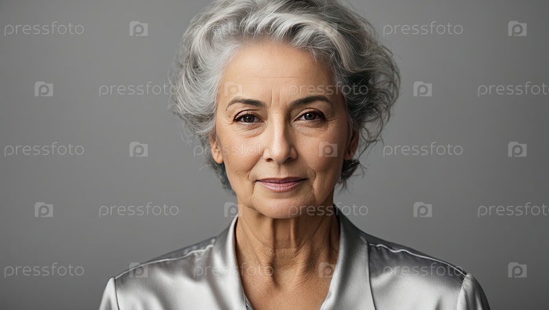 Пожилая женщина с светло-серыми короткими волосами, одетая в шелковистую серебряную блузку, мягко улыбающаяся в студии, позитивное старение, элегантный стиль, классическая красота, зрелая уверенность в себе