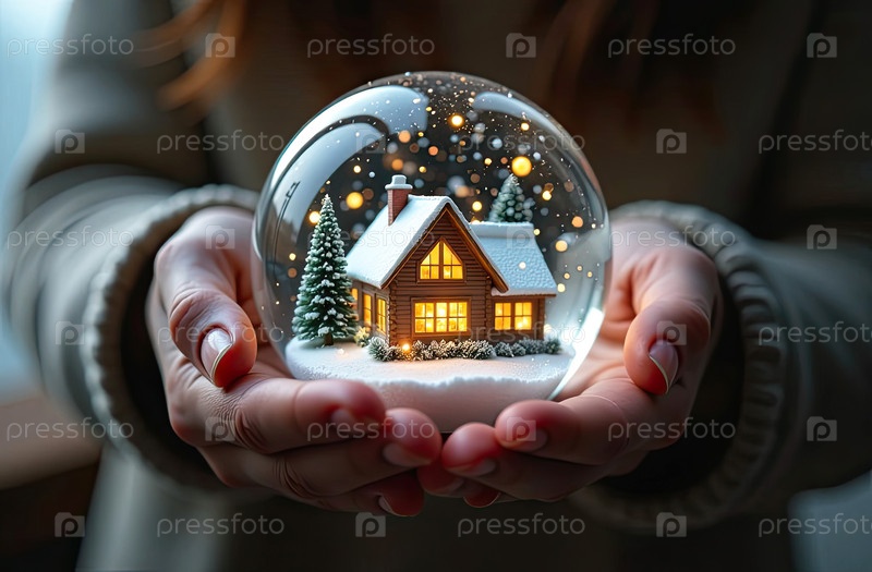 Магический стеклянный шар с крошечным современным домом и снегом внутри в уютной руке с рождественской елкой с гирляндами на фоне. страхование, ипотека, покупка недвижимости. ИИ генерируется
