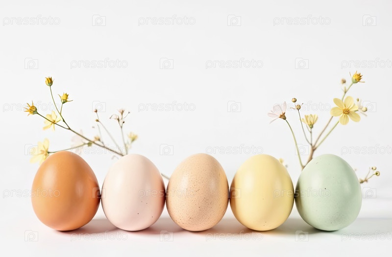 Внизу изображения пять яиц со свободным пространством сверху изображения для текста, с применением естественных весенних цветов на пастельных цветах яйца, белый фон. Пасхальный баннер с пробелом для текста. ИИ генерируется