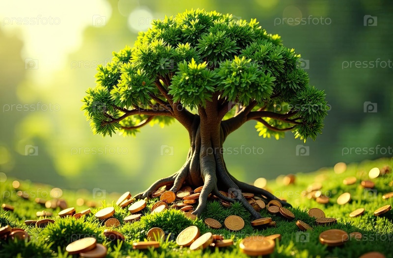 Взрослое зеленое дерево растет из земли и золотые монеты на природном фоне. Древо денег, экономика, финансы, экология, бизнес, стартап. ИИ генерируется