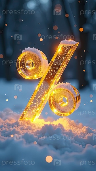 Неон светящийся золотой процентный знак на снежном фоне снаружи, блеск и снежинки. Зимняя распродажа и скидки, Черная пятница, Новый год, Рождество. баннер, флаер с копировальным пространством. ИИ генерируется
