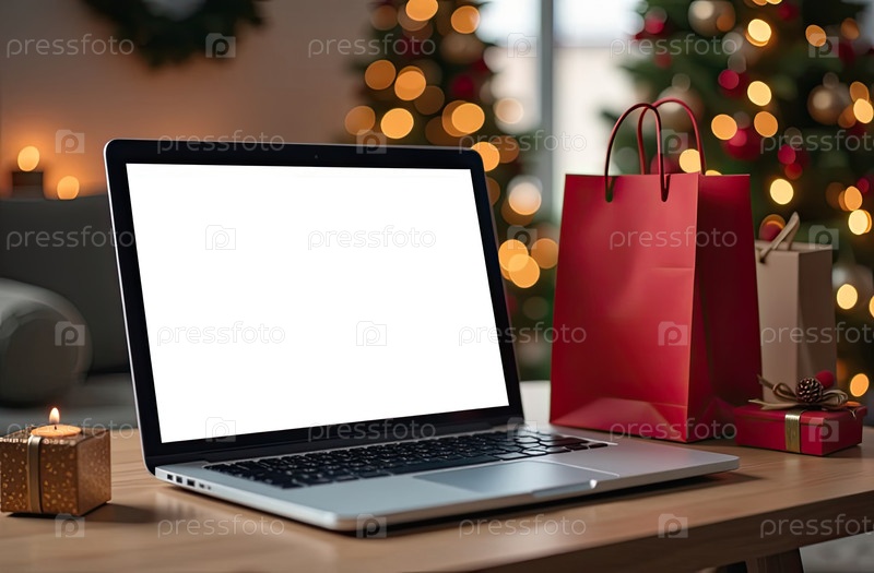 Ноутбук с белым экраном макет на столе на фоне рождественского декора уютного помещения с елкой, фейриными огнями