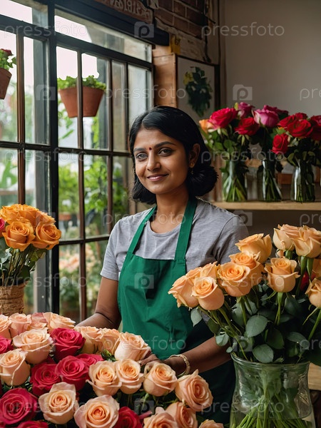 Индийская цветочная девушка с букетом оранжево-розовых тюльпанов и роз, устраивающая подарки на праздник Холи и весенние свадьбы