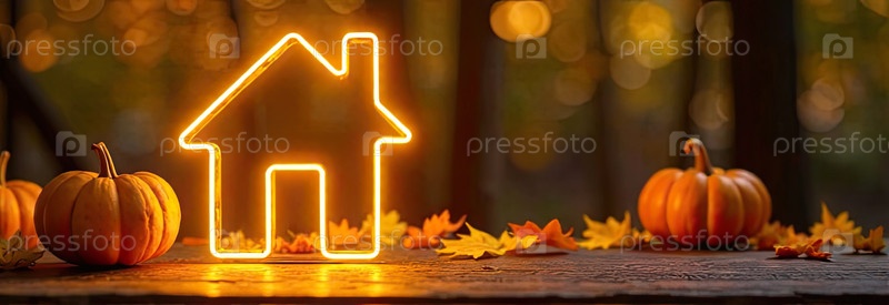 Золотой неон светящийся логотип Крошечный дом с тыквами и желтыми кленовыми листьями на осеннем фоне. Недвижимость, дача, летний домик, ипотека, страхование, бронирование, строительство, изоляция. ИИ генерируется
