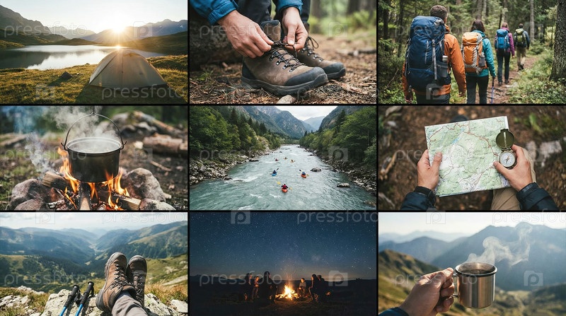 Коллаж пешеходов, кемпинга, горных рек и ночного костра, приключений на открытом воздухе, групповых поездок, исследований, походов