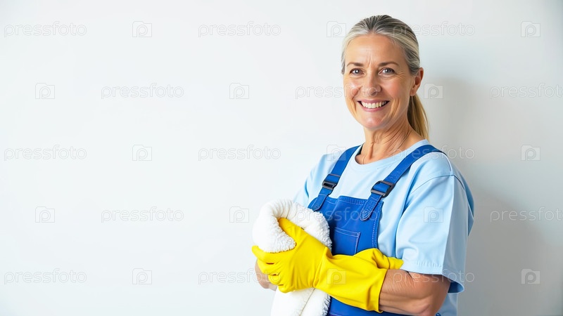 Портрет взрослой белокожей женщины в синем фартуке и желтых резиновых перчатках с тряпкой в руке возле белой стены со свободным местом для текста, услуги очистки окон, уборки дома, горничной