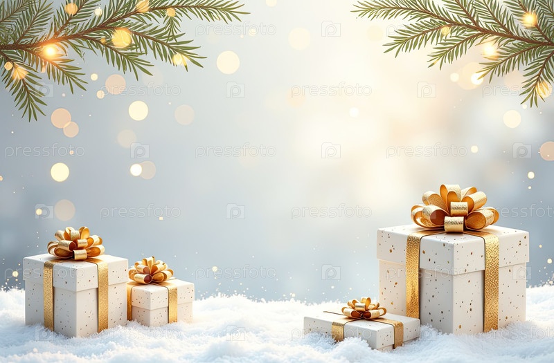 Рождественский голубой фон с белыми коробками для подарков со золотыми лучами, светящимся боке и блеском. Праздничное настроение Карточка на Рождество и Новый год с копировальным пространством. ИИ генерируется