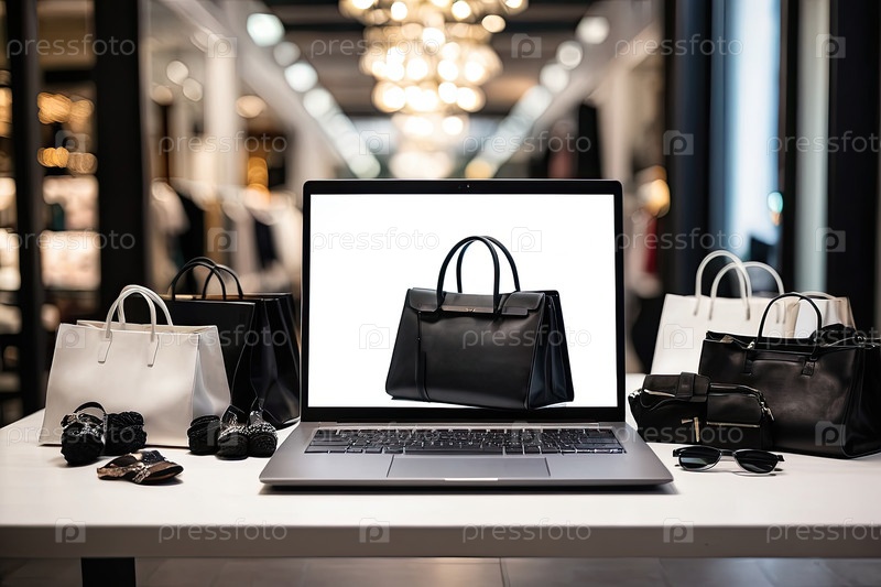 Ноутбук с белым экраном макет на столе в офисе в торговом центре рождественского декора с сумками, сумочками для покупок, пакетами, Черная пятница,