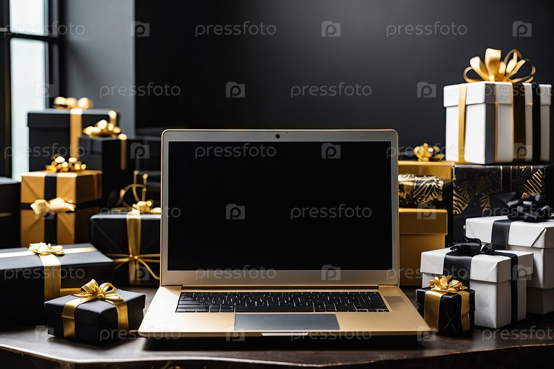 Макет ноутбука с черным экраном на столе в офисе с коробками для подарков сотрудникам, магазины, корпоративные подарки, Черная пятница, Рождество и Новый год