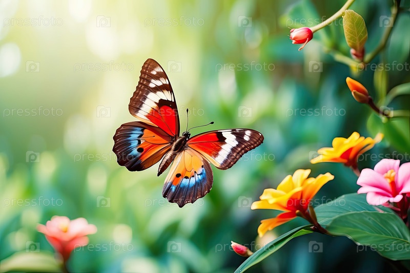 Зеленый цветочный фон с тропическими бабочками, пышный летний сад и пустая зона копирования для текста или сообщения