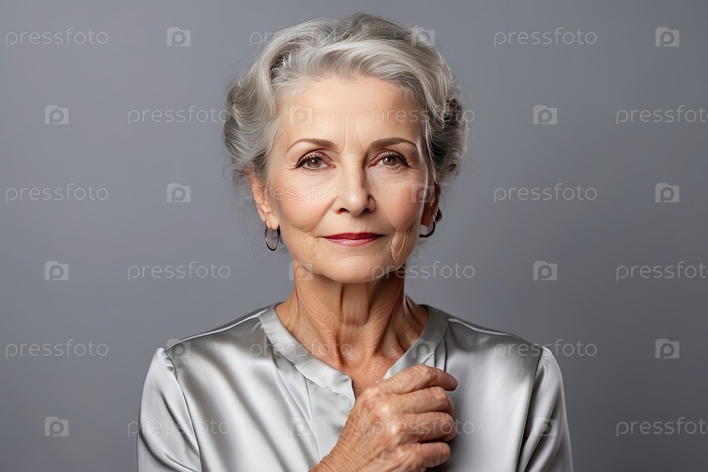 Пожилая женщина с серебристыми волосами и блузкой, нежно улыбающаяся со сложенными руками в студии, уверенность, элегантная красота, позитивное старение, зрелая гордость