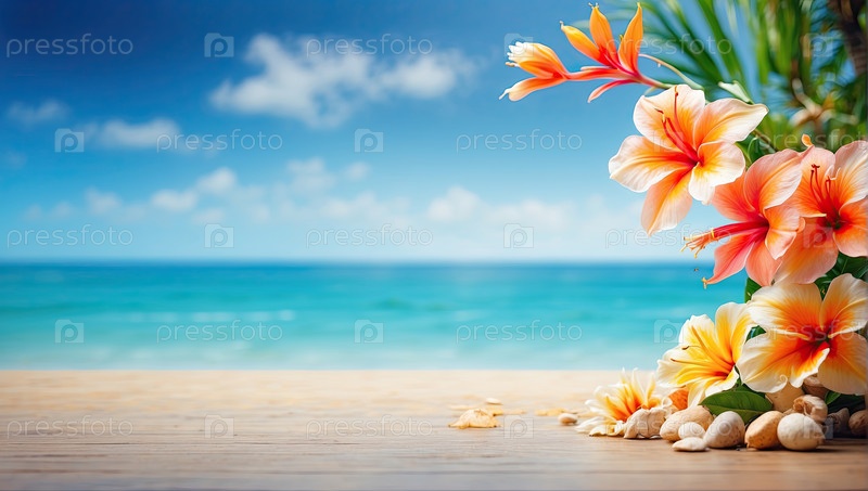 Тропический летний пляжный фон с цветами, голубым морем и небом, много места для копирования текста или слогана