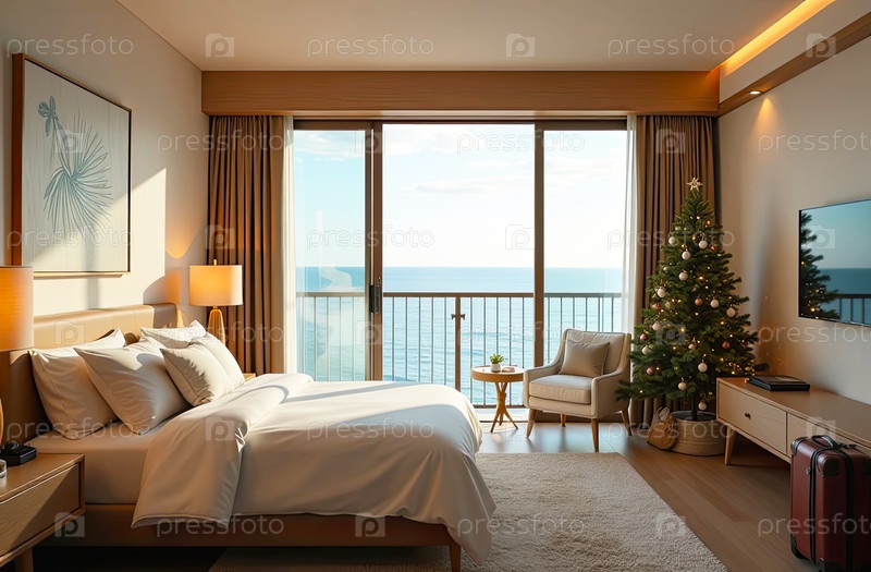 Гостиничный номер с видом на океан с рождественской елкой Внутренний декор для Рождества во время отпуска в тропической стране с пальмами при закате. Путешествие на Рождество и Новый год, экскурсия по курорту. ИИ генерируется