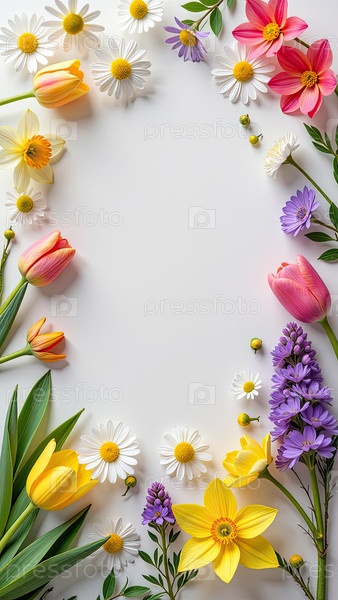Рамка с весенними цветами тюльпаны, нарциссы на белом фоне - Весенняя открытка со свободным текстом для 8 марта, женского дня, Пасхи