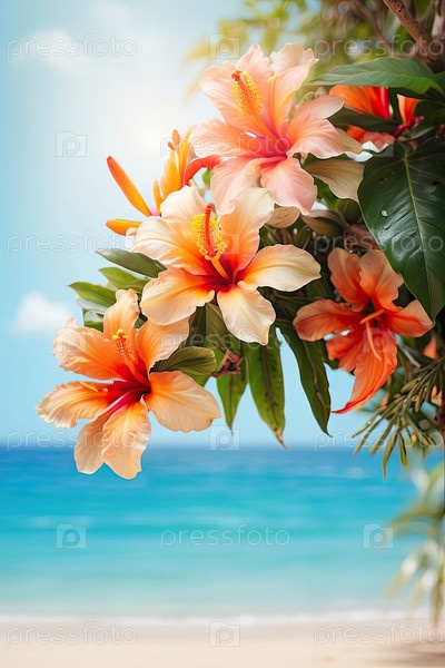 Высокая вертикальная картина с цветами плюмерии, голубым небом, морем и ярким копировальным пространством для сообщения или слогана