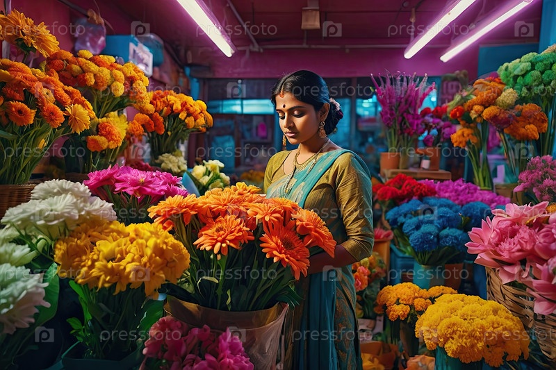 Индийская женщина в сари с красочными цветами на рынке, готовя праздничные гирлянды для Холи, Дивали и декора храма
