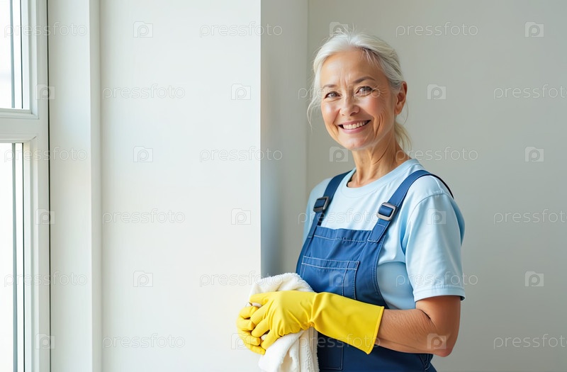 Портрет взрослой азиатской женщины в синем фартуке и желтых резиновых перчатках с тряпкой в руке у окна против белой стены, служба очистки окон, уборка дома
