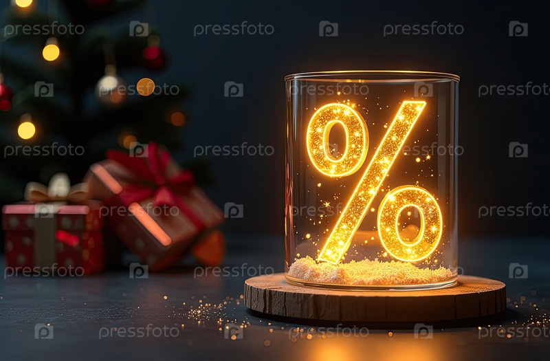 Неон светящийся золотой процентный знак на рождественском фоне с елкой, блесками и коробками для подарков. Черная пятница, Новый год, Рождественская распродажа, скидки. баннер, флаер с копировальным пространством. ИИ генерируется