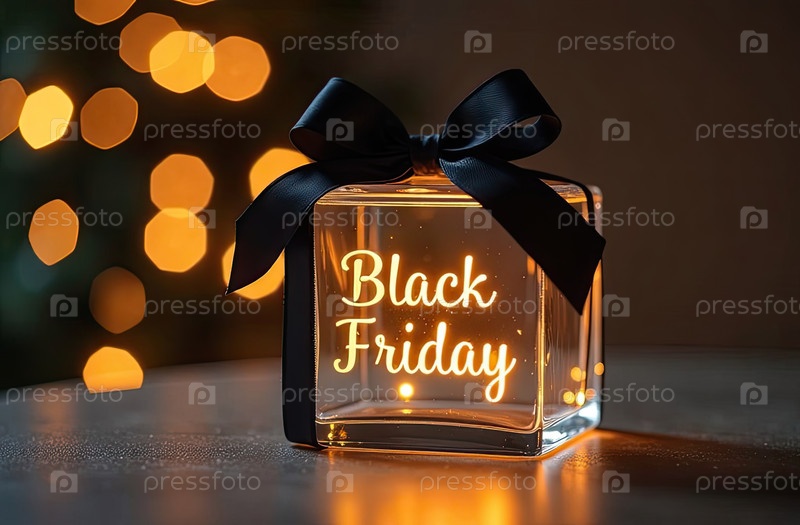 Неоновые светящиеся золотые буквы "Черная пятница" на прозрачной подарочной коробке с праздничным фоном золотистого бока. витрина магазина для Черной пятницы, распродажи, скидки, листовки, созданные ИИ