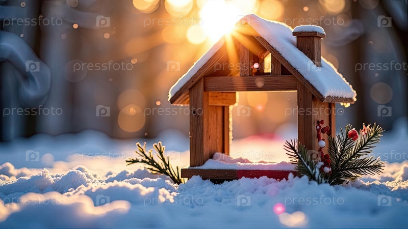 Уютный каркас крошечный дом на снегу и заснеженном фоне в солнечных лучах, с рождественским декором. недвижимость, риэлторская деятельность, ипотека, страхование, бронирование, зимовка, изоляция, отопление. ИИ генерируется