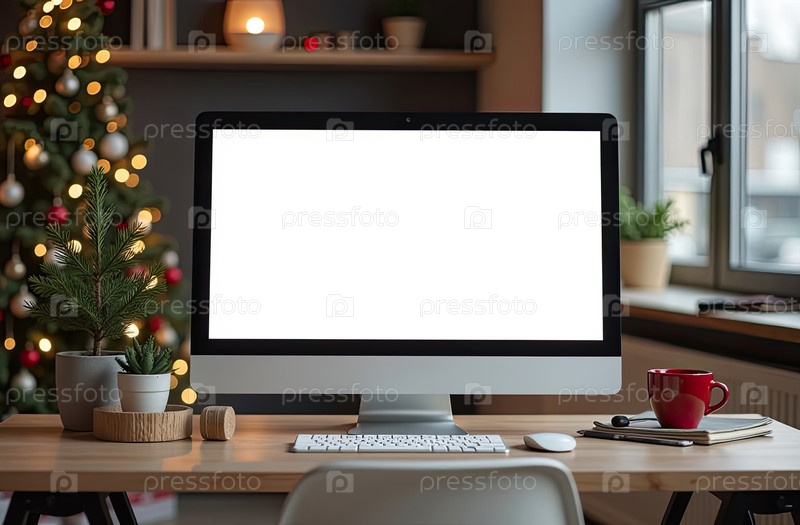 Ноутбук с белым экраном макет на столе в уютном домашнем офисе рождественского декора в стиле лофт