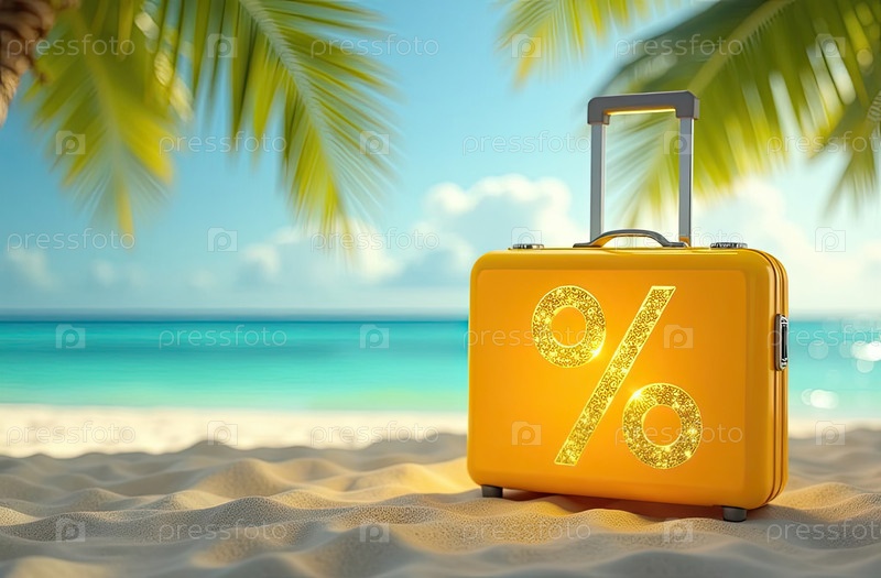 Золотой светящийся знак процент И желтый чемодан на берегу моря с тропическими пальмами под ярким солнцем, океанический закат в фоне. Горячие летние распродажи и скидки, горячий туристический баннер, листовка. AI генерируется