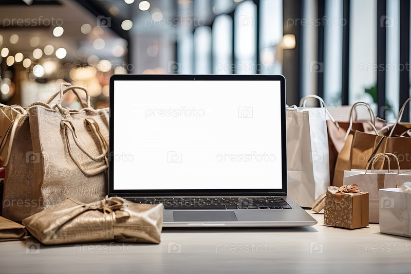 Ноутбук с белым экраном макет на столе в офисе в торговом центре рождественского декора с сумками, сумочками для покупок, пакетами, Черная пятница,