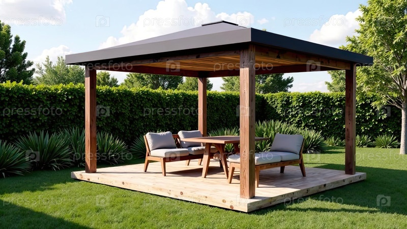 Газебо с зоной для барбекю во дворе дома с барбекью, плитой, столом, крышей