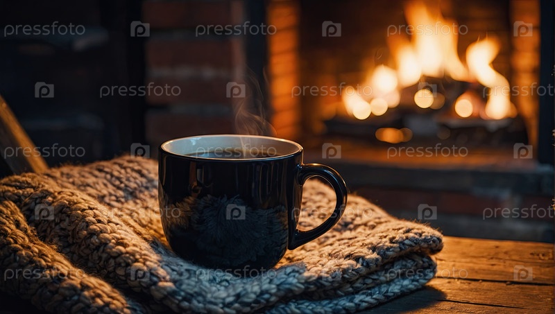 Теплая чашка кофе возле камина в уютном теплом трикотажном платье и рождественский декор.Уютная зима, Рождество, Новый год. ИИ генерируется