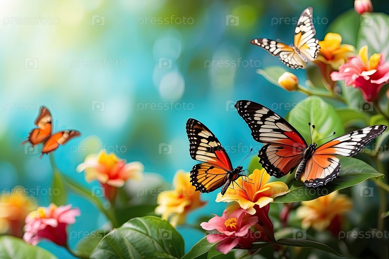 Тропические бабочки на оранжевых и розовых летних цветах, зеленый фон и свободное пространство для копирования вашего сообщения