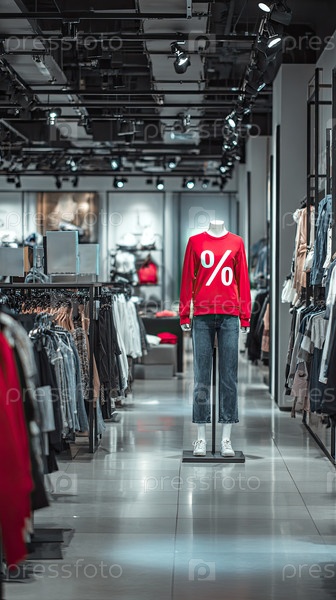 Магазин модной одежды с продажей манекена, красный свитер, знак процента, городской стиль, доступная промо-мода