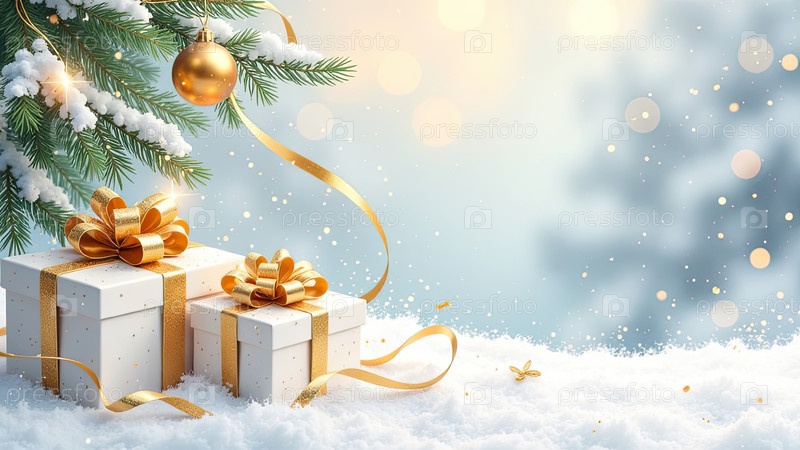 Рождественский голубой фон с белыми коробками для подарков со золотыми лучами, светящимся боке и блеском. Праздничное настроение Карточка на Рождество и Новый год с копировальным пространством. ИИ генерируется