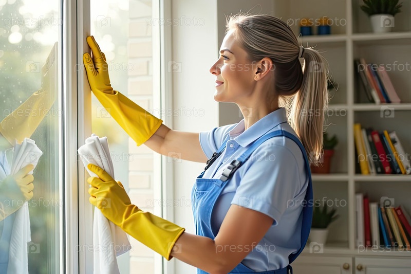 Молодая женщина в синем фартуке и желтых резиновых перчатках с тряпкой в руке моет окно во внутренней части дома с книжной полкой, услугами по уборке окон, уборка дома