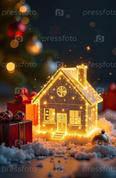 Прозрачное золото светящийся символ дома и коробка для подарков под елкой на рождественском фоне с золотым блеском