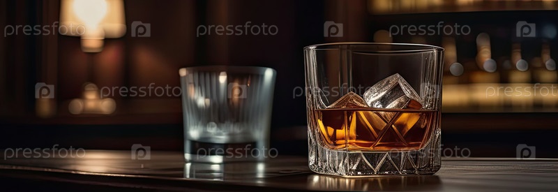 Широкий фон с виски на льду в баре, настроенный вечер, барная стойка, пространство для копирования текста