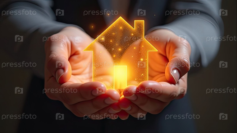 Золото светящийся символ уютного дома В ладонях рук с золотым блеском. Недвижимость, риэлтор, ипотека, страхование, бронирование, изоляция, мечта о собственном доме. ИИ генерируется