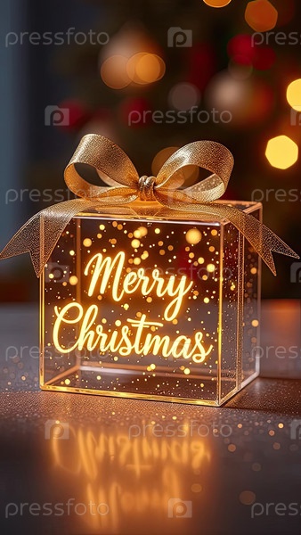 Золотая Рождественская надпись на прозрачной светящейся коробке для подарков на праздничном фоне с гирляндами боке с пространством для текста. Поздравления, открытки. ИИ генерируется