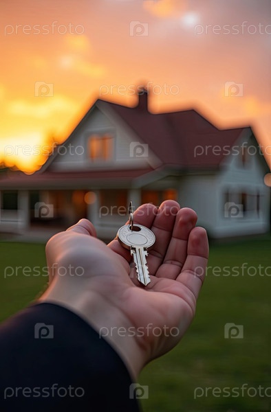 Ключ от дома в руках агента по недвижимости рядом с коттеджем - продажа, перемещение, бронирование, проект коттеджа, ипотека, жилищное страхование