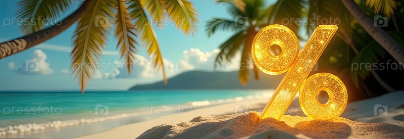 Яркий золотой процентный знак на берегу моря с тропическими пальмами в свете солнца, туристический морской фон. жаркая летняя распродажа и скидки, горящий тур-баннер, флаер. ИИ генерируется