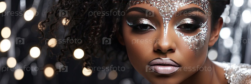 Африканская женщина с блестящим карнавальным макияжем, глубокими губами, яркими глазами, золотым тоном кожи, стилем новогодней и рождественской вечеринки