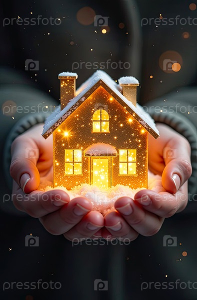 Золото светящийся символ уютного дома на снегу В ладонях рук с золотым блеском. Недвижимость, риэлтор, ипотека, страхование, бронирование, зимовка, изоляция, отопление. ИИ генерируется